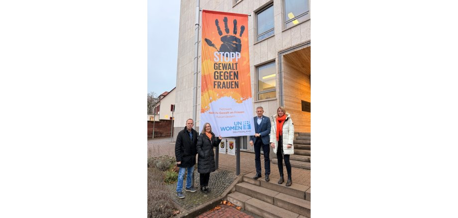 Landrat Ralf Leßmeister, 1. Kreisbeigeordnete Gurdrun Heß-Schmidt, Kreisbeigeordneter Peter Schmidt und die Gleichstellungsbeauftragte Dorothee Müller setzen ein sichtbares Zeichen gegen Gewalt an Frauen und hissen anlässlich des Internationalen Tages zur Beseitigung von Gewalt gegen Frauen die Flagge von UN Women an der Kreisverwaltung Kaiserslautern.