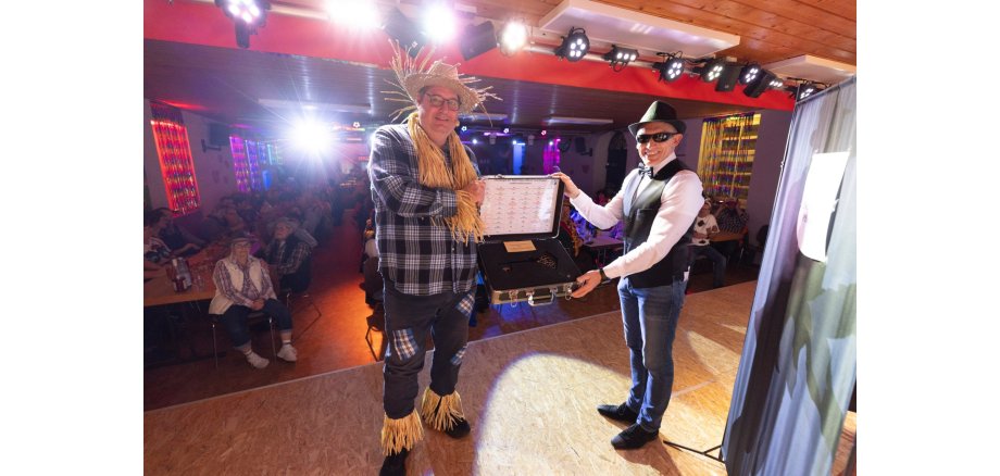 Zusammen mit der ehemaligen Ersten Kreisbeigeordneten Gudrun Heß-Schmidt bekam der Landrat den Karnevalsorden des MUV überreicht. Leßmeister und Heß-Schmidt traten als Man und Women in Black auf.