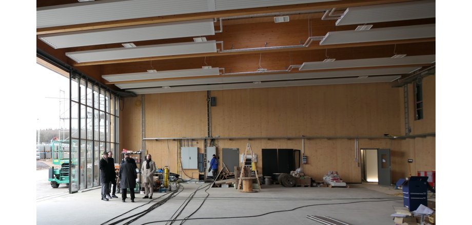 Für die Landräte ging es bei dem Ortstermin auch um die Holzbau-Konstruktion und ihre Anwendung in anderen Bereichen. Der Holzbau hat unter anderem Potential im Bildungsbereich und bei Bauten für die Feuerwehren, im Katastrophenschutz, im Zivilschutz und bei Rettungswachen.