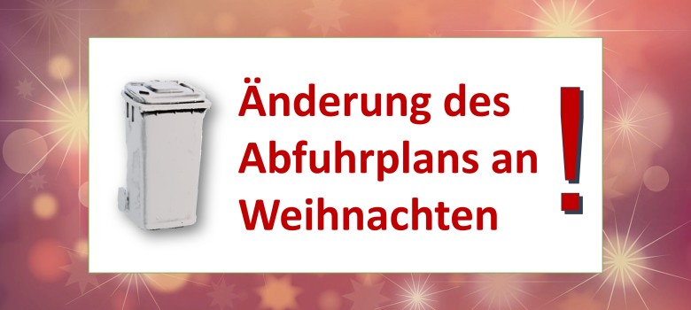 In der 52. Kalenderwoche sind infolge der beiden Weihnachtsfeiertage vier Vorverlegungen notwendig. D. h., dass alle Haushalte, die am 22., 23., 24. oder 25. Dezember Abfuhr hätten, Ihre Abfallgefäße früher bereitstellen müssen – siehe nachfolgenden Zeitplan.