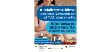 Am 18. November um 18:00 Uhr veranstaltet die Atlantische Akademie Rheinland-Pfalz e.V. in Kooperation mit der Landesarbeitsgemeinschaft der kommunalen Frauen- und Gleichstellungsbeauftragten Rheinland-Pfalz den Online-Vortrag #Tradwife statt #Girlboss? Konservative Geschlechterbilder auf TikTok, Instagram und Co. Referieren wird die Soziologin Viktoria Rösch von der Frankfurt University of Applied Sciences.