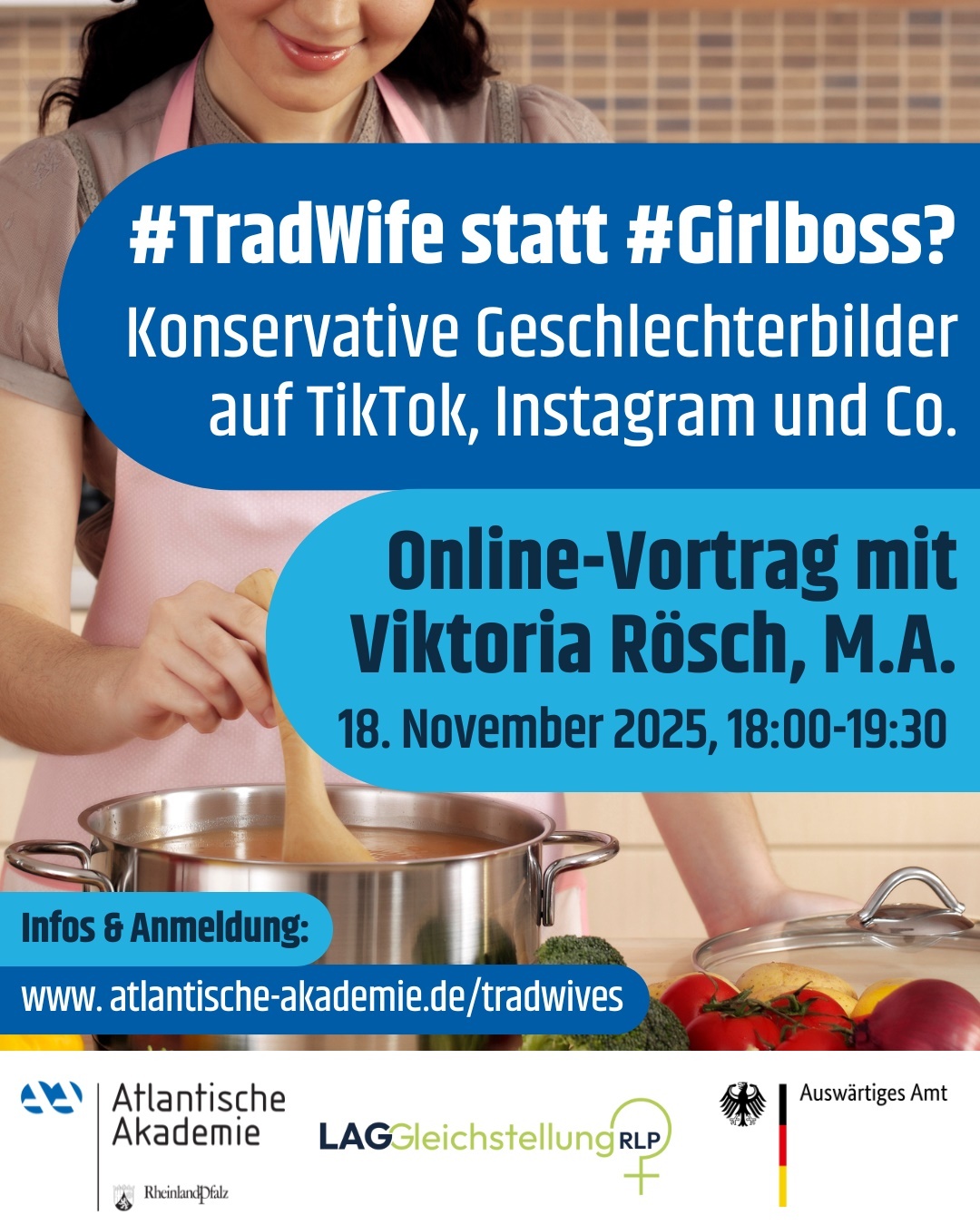 Am 18. November um 18:00 Uhr veranstaltet die Atlantische Akademie Rheinland-Pfalz e.V. in Kooperation mit der Landesarbeitsgemeinschaft der kommunalen Frauen- und Gleichstellungsbeauftragten Rheinland-Pfalz den Online-Vortrag #Tradwife statt #Girlboss? Konservative Geschlechterbilder auf TikTok, Instagram und Co. Referieren wird die Soziologin Viktoria Rösch von der Frankfurt University of Applied Sciences.