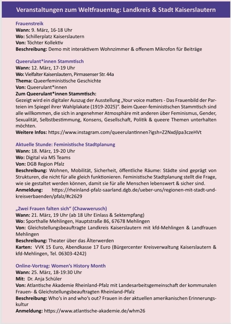 Anlässlich des Internationalen Frauentages, lädt die Gleichstellungsbeauftragte des Landkreises Kaiserslautern in Kooperation mit der kfd-Mehlingen sowie den Landfrauen Mehlingen am Samstag, 21. März 2026 in die Sporthalle Mehlingen ein.