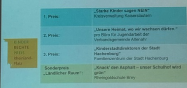 Neben einem lustigen Zauberer, der durch das Programm führte, wurde zunächst der Sonderpreis ländlicher Raum und der 3. Preis verliehen. Die Spannung stieg immer weiter an, wobei dann bei der Verkündigung des 2. Preises klar war, dass das Projekt der Kreisverwaltung Kaiserslautern den 1. Preis gewonnen hatte. Ministerin Katharina Binz verlieh gemeinsam mit der Kinderjury den Preis an die beteiligten Kinder. Neben erfrischenden Getränken, einem schönen Buffet, einem Geschenk und fröhlichen Gesichtern können sich die beteiligten Schulen über ihren Anteil freuen. Herzlichen Glückwunsch an die Grundschulen in Miesau, Landstuhl in der Au und Landstuhl Atzel, Enkenbach-Alsenborn, Bruchmühlbach-Martinshöhe, Weilerbach, Ramstein-Miesenbach, Otterbach, Mehlingen sowie die Förderschulen Enkenbach-Alsenborn und Landstuhl.